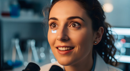 A close-up portrait of a young female scientist with a look of sheer wonder and excitement on her face while using a microscope in a laboratory. A small, glowing data interface is reflected in her wide-open eye, symbolizing a significant discovery or breakthrough. The image captures the joy and passion of scientific research.