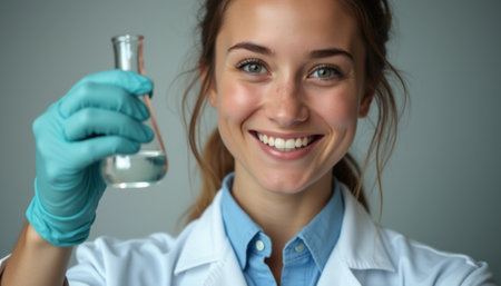 A cheerful young woman in a lab coat and gloves proudly holds a flask filled with clear liquid, radiating enthusiasm for science. Her bright smile and confident pose embody the spirit of discovery and innovation in the laboratory.