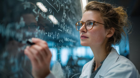 physicist writing equations on transparent board in research center.