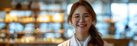 Asian female ophthalmologist in white coat smiling with confidence in eyeglasses shop.