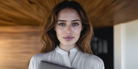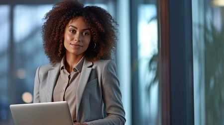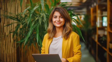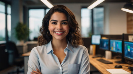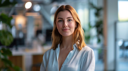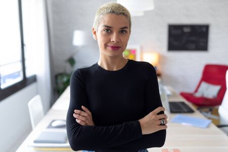 Portrait of modern young entrepreneur woman looking at camera while standing in the office.