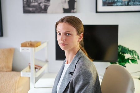 Portrait of young businesswoman in elegant suit looking at camera while visiting seminar