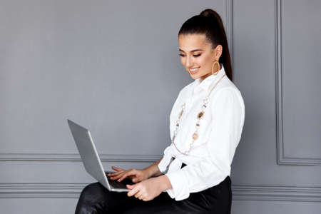 Profile portrait of a smiling young business woman with nice make-up, smiling and looking at the laptop, isolated on a grey background. Job, working modern concept. Copy space. Horizontal view.
