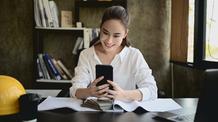 A beautiful, smiling Asian female architect or interior designer using her smartphone at her desk in the office. chatting, responding to messages, scrolling on social media, using app