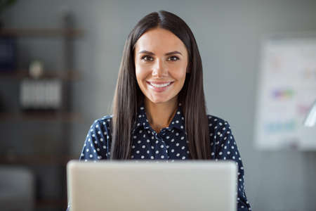 Photo of charming young brown haired business woman wear blue dotted shirt sit computer indoors in office