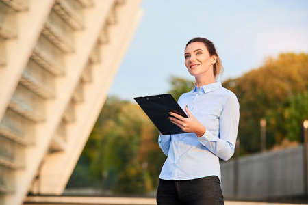 Businesswoman with clipboard smiling. Happy caucasian female outdoor. How to find dream job.
