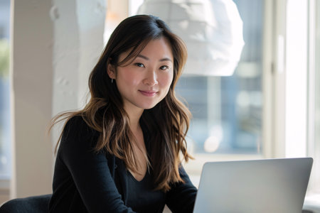 Smiling of active asian modern business woman with laptop in hand on the office.