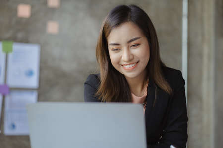 Asian business woman Working on laptop on desk . Independent woman reading financial graph chart. Marketing analysis planning hand of a girl working in the office