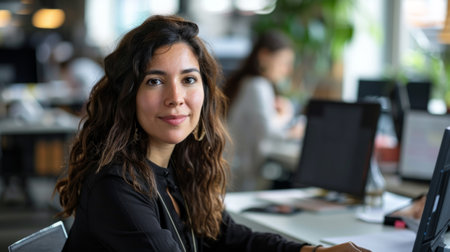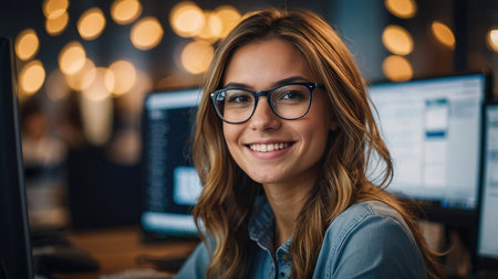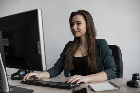 Brunette woman is working in front of a monitor in a office. Business woman working at computer at coworking space. Portrait of happy lady typing at workplace. Female professional working with pc.