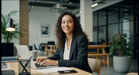 Professional female freelancer working on her project while typing on laptop computer in modern workplace