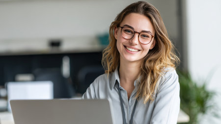 Woman working on laptop looking at camera