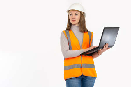 Young woman construction manager. Woman builder isolated portrait with protect helmet and laptop computer. Woman isolated face portrait, banner with mock up copy space.