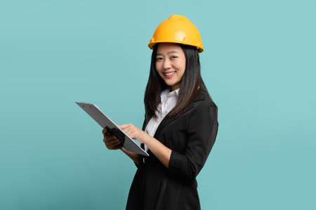 beautiful young asian woman engineer and safety helmet on white background, construction concept, Engineer, Industry.