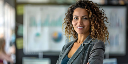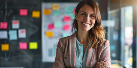 Woman entrepreneur smiling at camera standing in conference room, preparing for meeting with partners. Project manager working in professional start up financial business ready for brainstorming