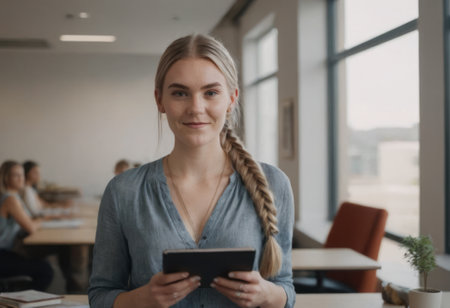 Young woman looking at camera while using tablet at work