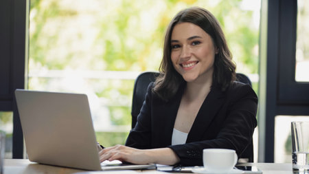 Portrait of beautiful young smiling brunette business woman working on a laptop in office,looking back