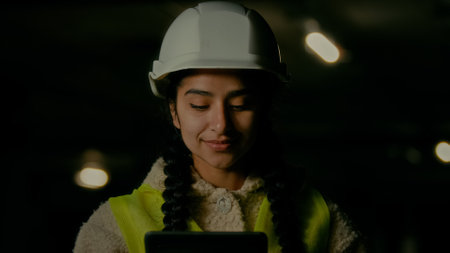 Female inspector supervisor architect developer angry annoyed woman in hardhat inspecting bad engineering work on underground parking use electronic digital tablet computer pad control manufacturing