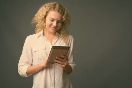 Young beautiful businesswoman with curly blond hair against gray background
