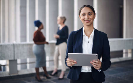 Young business woman looking at camera while standing with digital tablet in her hand