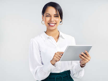 Were online, look us up. Studio shot of a young businesswoman using a digital tablet against a grey background.