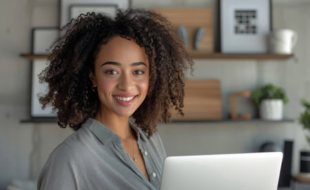 Happy attractive curly young African American woman in casual wear looking in distance, daydreaming, planning future or visualizing future standing in modern home office, inspiration concept.