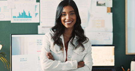 Portrait, business or happy Indian woman with arms crossed, pride and confidence in modern office. Consultant, professional and financial analyst with finance career, smile and corporate ambition