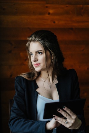 Young business lady with tablet at the window