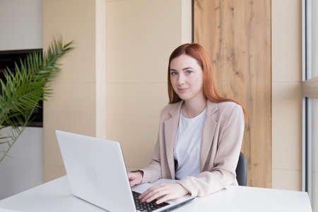 Young caucasian women work on laptop in modern office or online at home. Office worker. Remote. Online education.