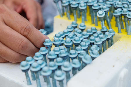 screws and nuts and bolts, stand on a light background, the hand moves the bolt construction concept