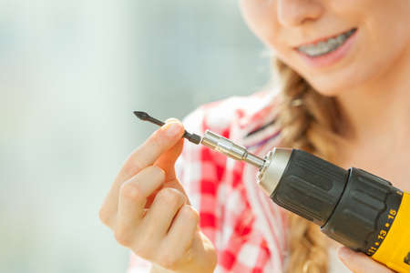 Young woman adjusting, changing her drill bit doing home renovation. Female construction worker having driller tool working on diy.