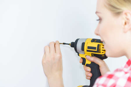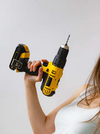 Woman holding yellow driller about to drill something. Hardware construction site objects concept.