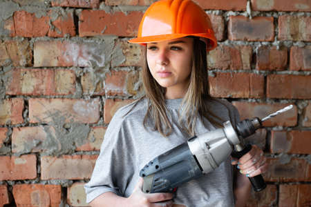 portrait photo on a brick wall background a woman is standing in a working form holding a construction drill. female construction worker.