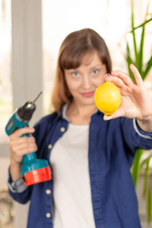 A young pretty woman in a blue shirt holds a screwdriver with a drill and a bright lemon against the background of a light window and green leaves of a houseplant. Selective focus. Concept photo