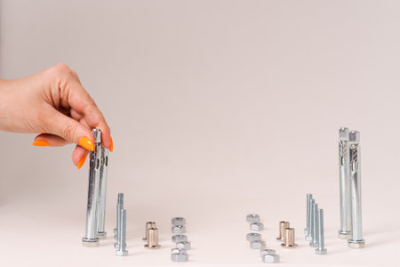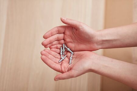 Female hands holding the screws in their hands. Concept for self-contained, easy furniture assembly.