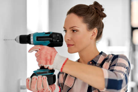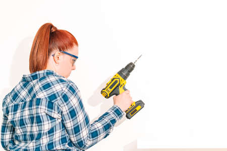 Young woman with checked shirt using drill for her work at home. Girl working at flat remodeling. Building, repair and renovation.