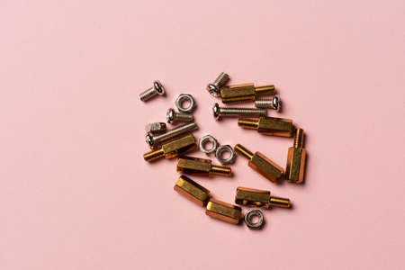 A close up of various brass nuts and screws arranged in a circular pattern on a dark textured surface. The fasteners are used for construction, repair, and industrial applications.