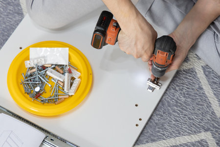 Close-up of mans hands using a power drill to screw parts together while assembling a cabinet at home