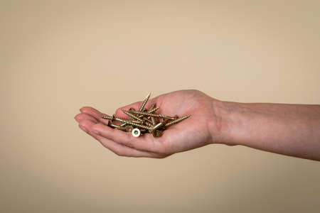 Female hands holding a handful of screws Hands show the golden screws . Home work, handywoman concept.