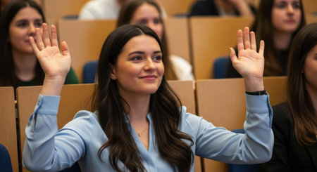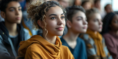 A diverse group of college students engaged in a lecture in a university classroom. Concept Education, College Life, Classroom Environment, Diversity, Student Engagement