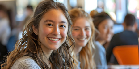 Happy teenage students in the classroom. Generative AI