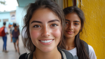 Two smiling students pose in a lively school setting, showcasing joy and youth. Their bright expressions capture the essence of friendship and learning.