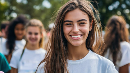 A smiling young woman in a white shirt stands outdoors with friends in the background. The image is set against a natural, blurred background, capturing a sense of friendship and happiness