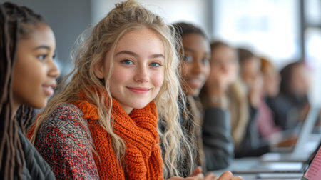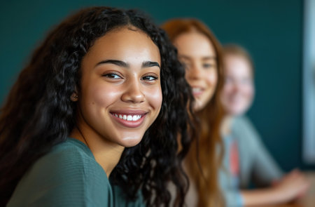 Empowering Young Women: Smiling and Collaborating at a Coding Workshop to Hone Programming Abilities. Concept Coding Skills, Empowerment, Workshop, Collaboration, Young Women