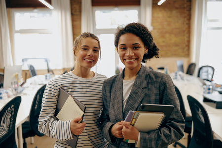 Portrait of two smiling female colleagues standing on office background and looks camera