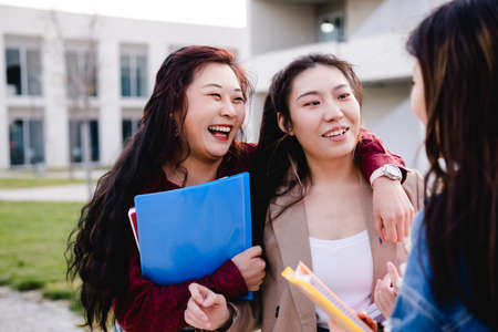 Young Asian woman college student with friends at outdoors. College student working on the college campus, education, school, study