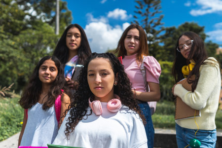 Selective focus portrait of a teenage student with curly hair wearing pink headphones on her neck with four girlfriends out of focus behind outdoors