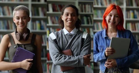 Collage of three happy multiethnic students smiling looking at camera posing in library. Vertical portraits, group of young university or college learners standing indoor. Education, study, knowledge