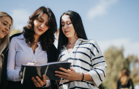 Young students discussing and collaborating in a sunny park, working together on a university project, aiming for better results and achieving goals.