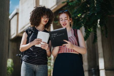 Two students sharing notes outdoors with a focus on education and collaboration