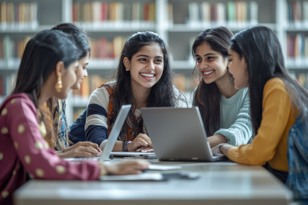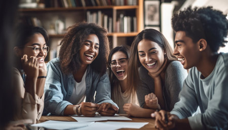 Collaborative study session among friends library group activity indoor close-up learning together